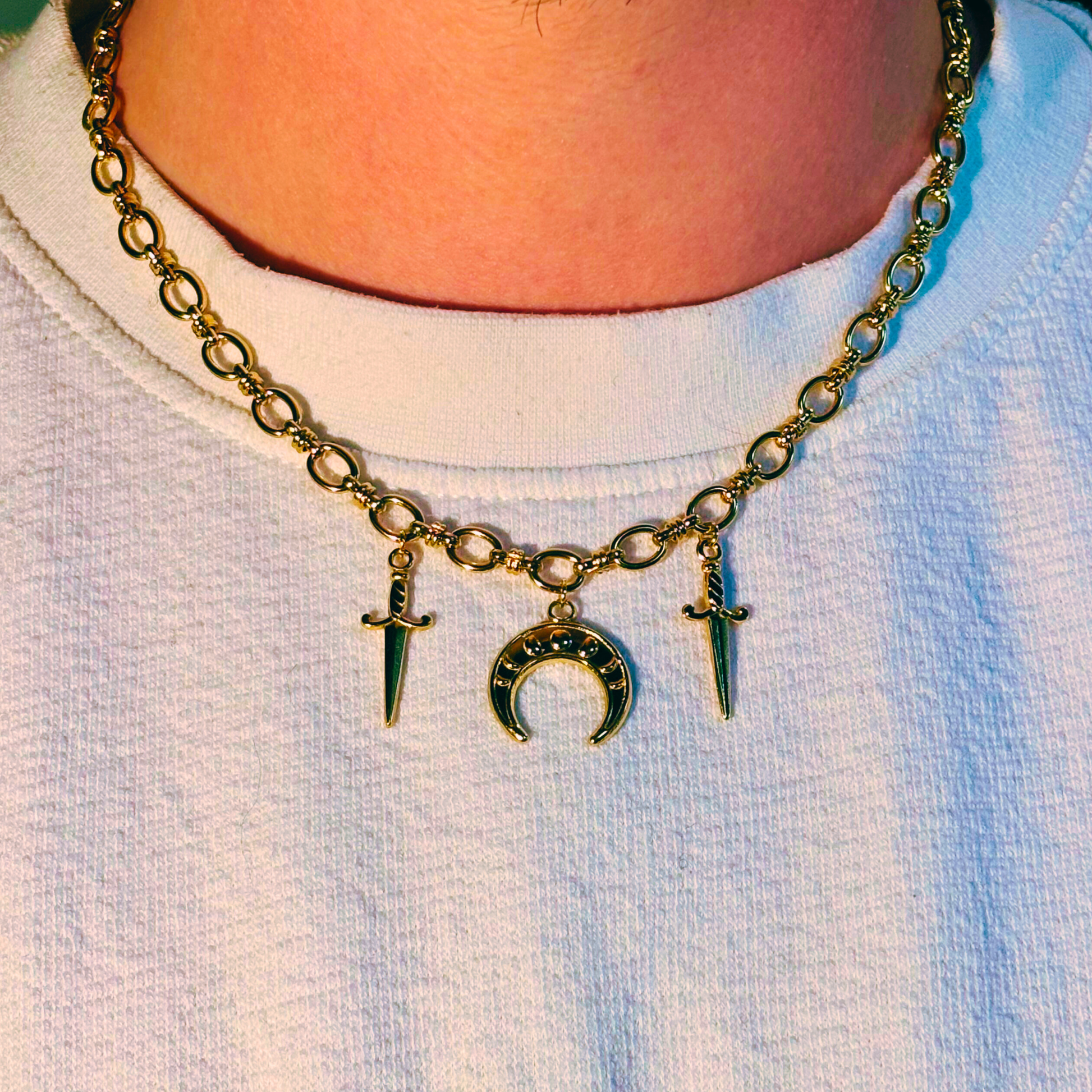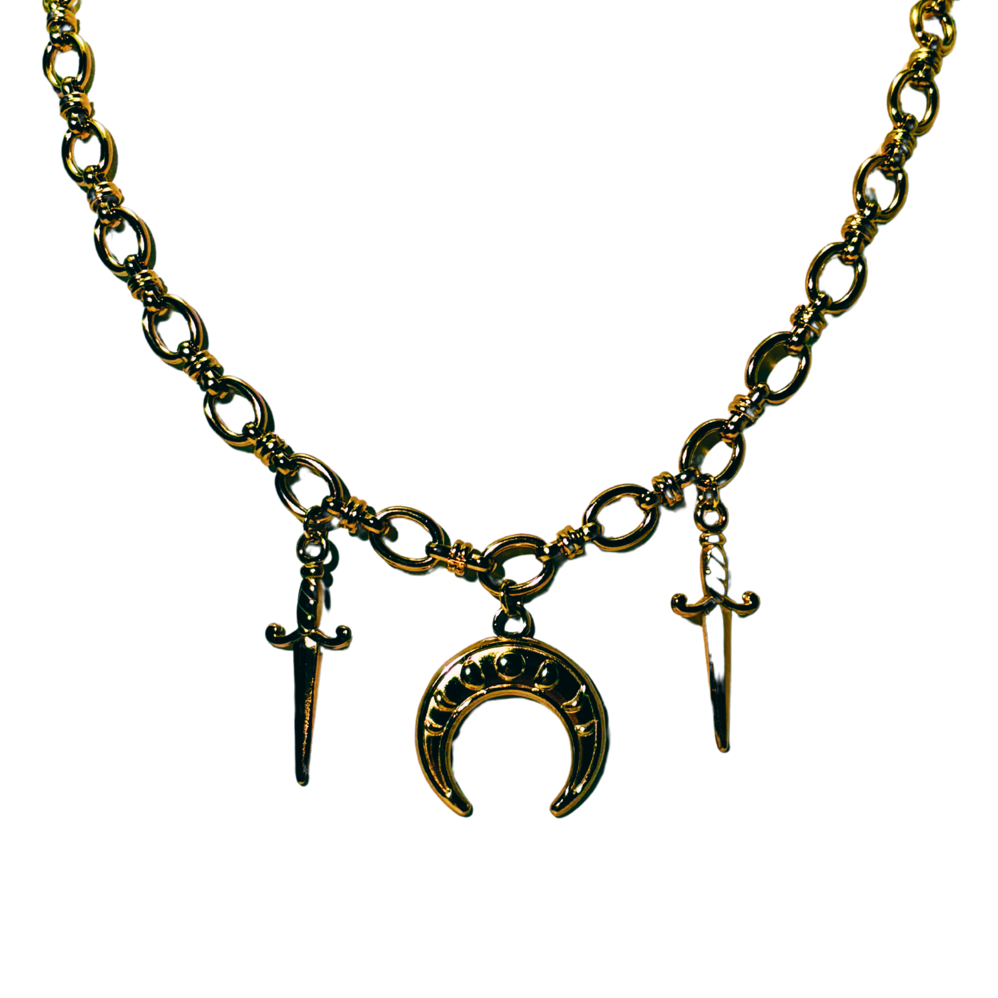 Le Collier Omen présente un croissant de lune suspendu sous deux épées — un pendentif qui évoque la puissance, l’intuition et la protection. Porté près du cœur, il canalise à la fois le calme de la nuit et la force d’affronter ce qui se cache dans l’obscurité. Parfait pour celles et ceux qui marchent sur la ligne entre l’ombre et la lumière.