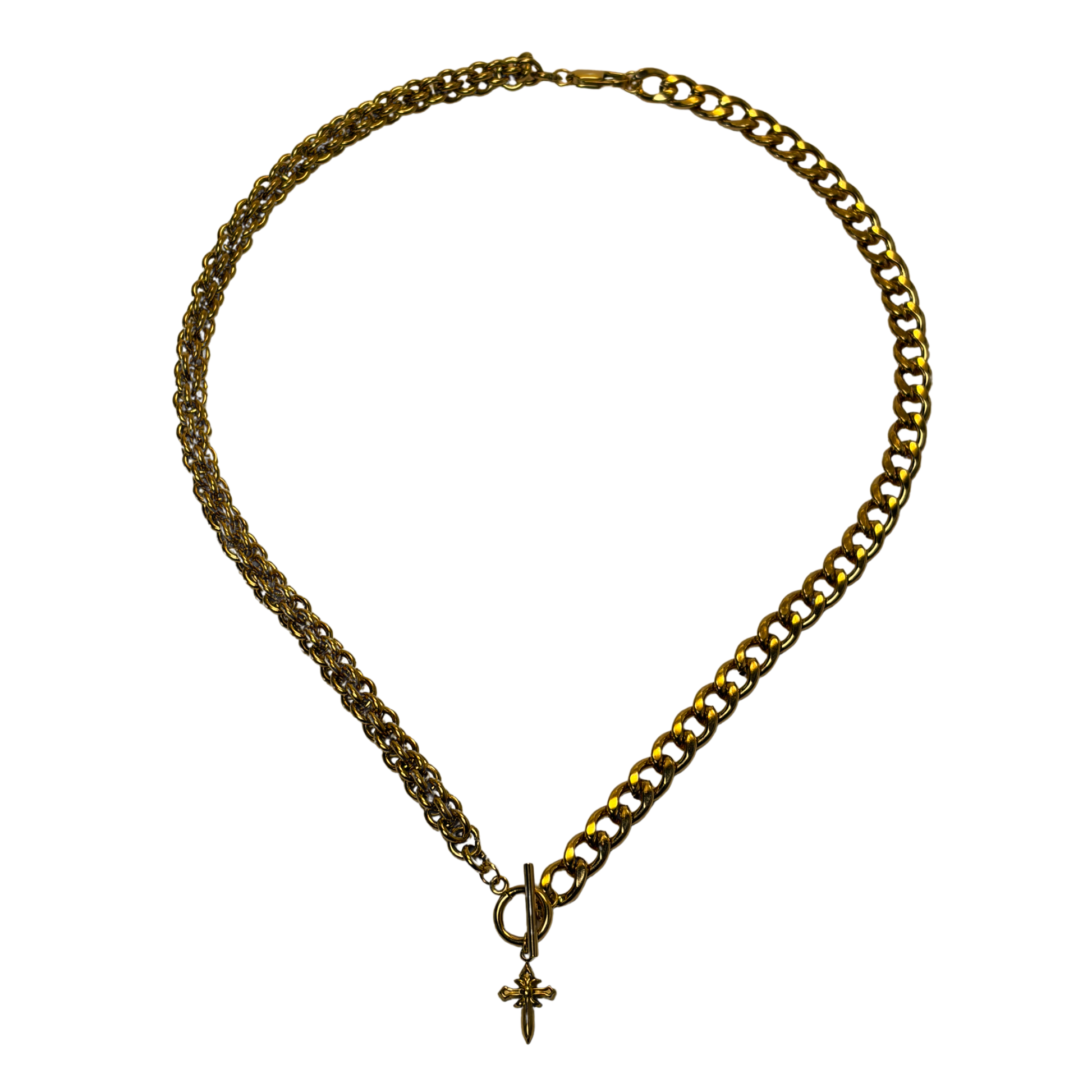 A bold take on classic chain layering. The Crimson Vine Necklace features a contrasting double-chain design finished with a delicate cross charm at the center. Structured yet refined, it balances statement and simplicity in one piece.